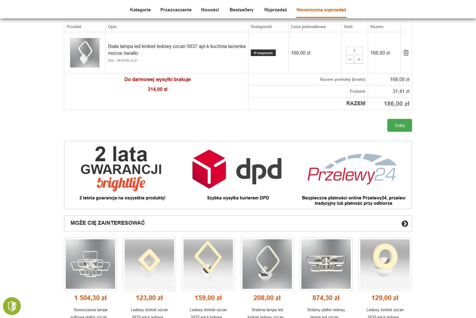 Przebudowaliśmy wygląd koszyka i procesu zamówienia, usunęliśmy zbędne rozpraszacze, zastępując je elementami, które zwiększają konwersję. Dodaliśmy wyraźne informacje o gwarancji, przesyłce i płatności, pokazaliśy informację ile brakuje do darmowej przesyłki, a także wyświetliliśmy powiązane produkty, pasujące do tych w koszyku. Zmieniliśmy też kolor przycisków, by zwiększyć intuicyjność procesu zamówienia.