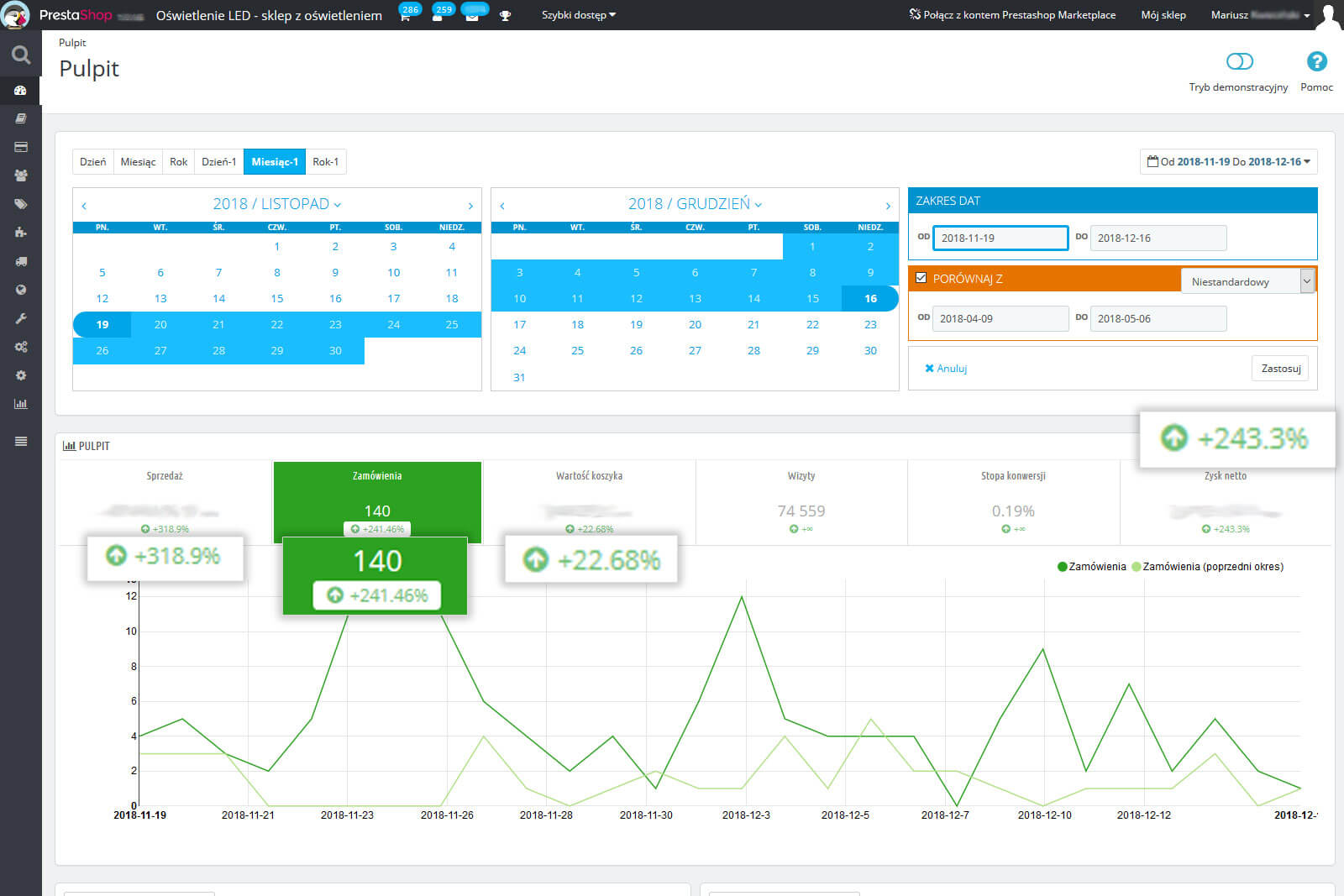 Zwiększenie ruchu organicznego, pozyskanie nowych klientów poprzez media społecznościowe, poprawa użyteczności sklepu, to wszystko przełożyło się na odczuwalne efekty biznesowe. Liczba transakcji wzrosła o 241%, optymalizacja pod cross-selling i up-selling spowodowała wzrost wartości koszyka o 22.6%, co razem przełożyło się na wzrost sprzedaży o 318%!!!