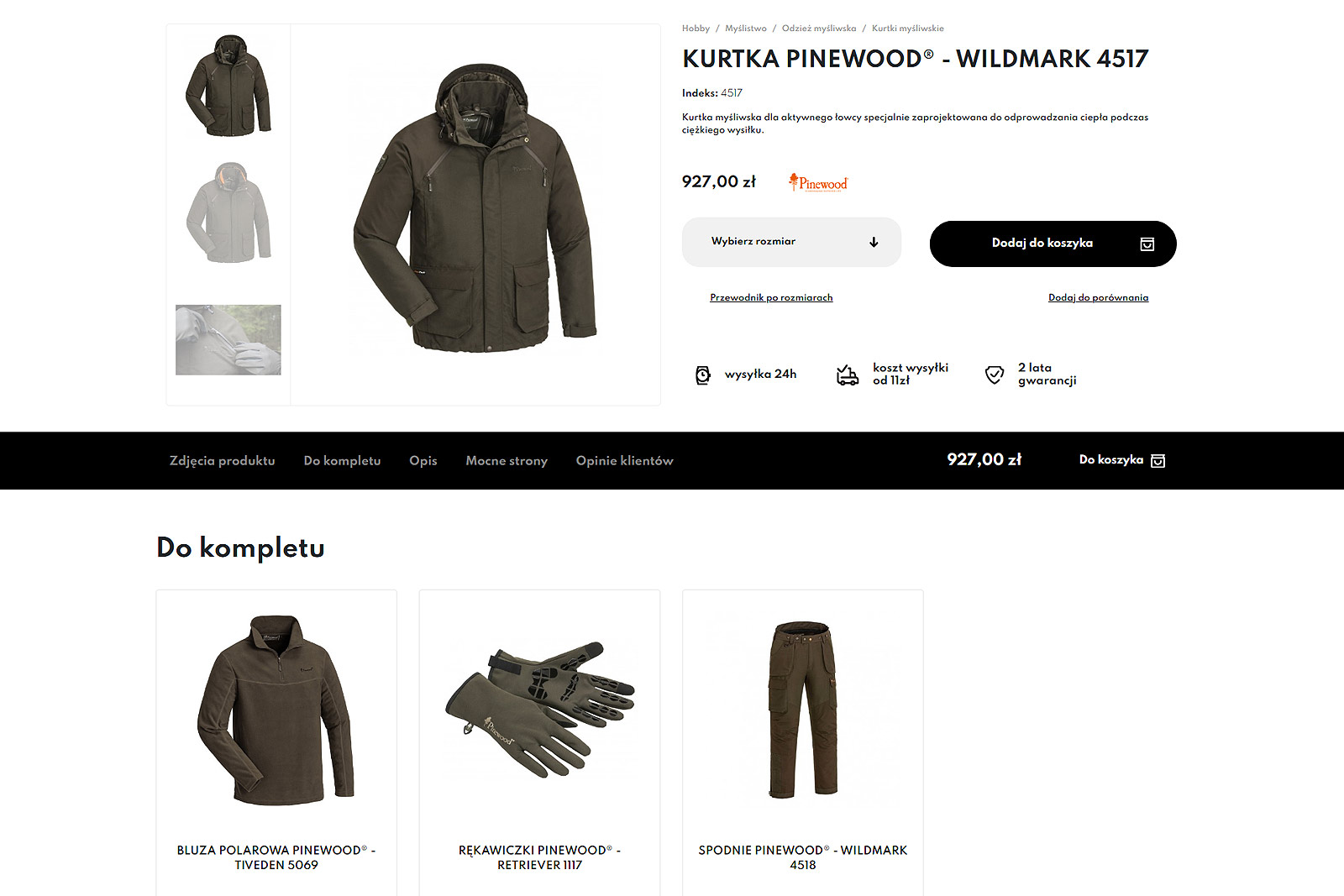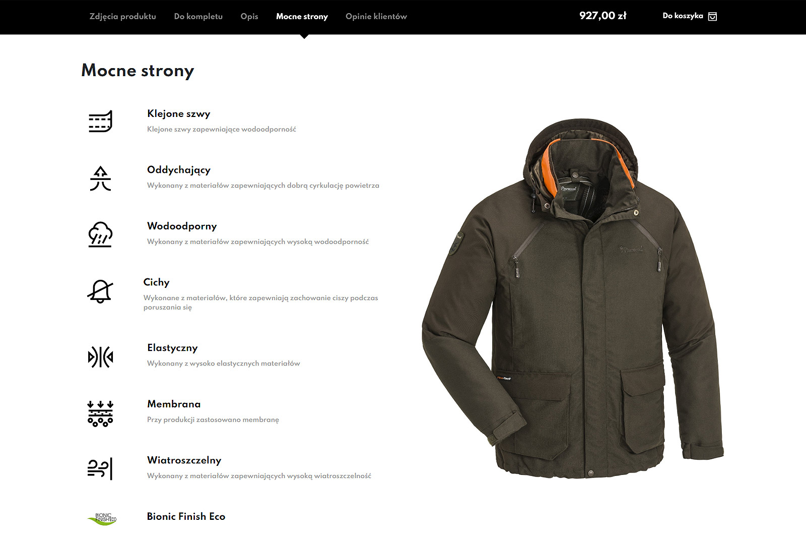 Wszystkie kluczowe elementy są łatwo dostępne dla klienta: kolory, rozmiary, tabela rozmiarów. Z uwagi na konieczność prezentacji dużej liczby informacji zastosowaliśmy taby, po których klient może sprawnie nawigować, przechodząc pomiędzy Zdjęciami, opisem, mocnymi stronami i opiniami o produkcie.