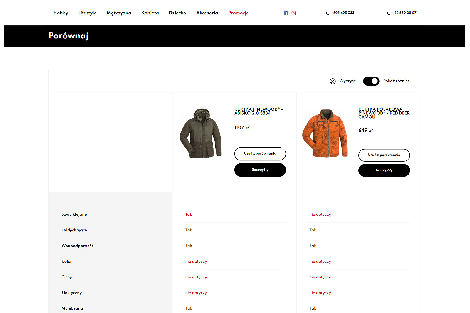 Zaprojektowaliśmy porównywarkę, która daje użytkownikom możliwość uwypuklenia różnic między produktami. Wystarczy kliknąć przycisk i atrybuty, którymi różnią się wybrane produkty, zmienią kolor. Zwiększyliśmy w ten sposób czytelność porównania, co przydaje się szczególnie na urządzeniach mobilnych.