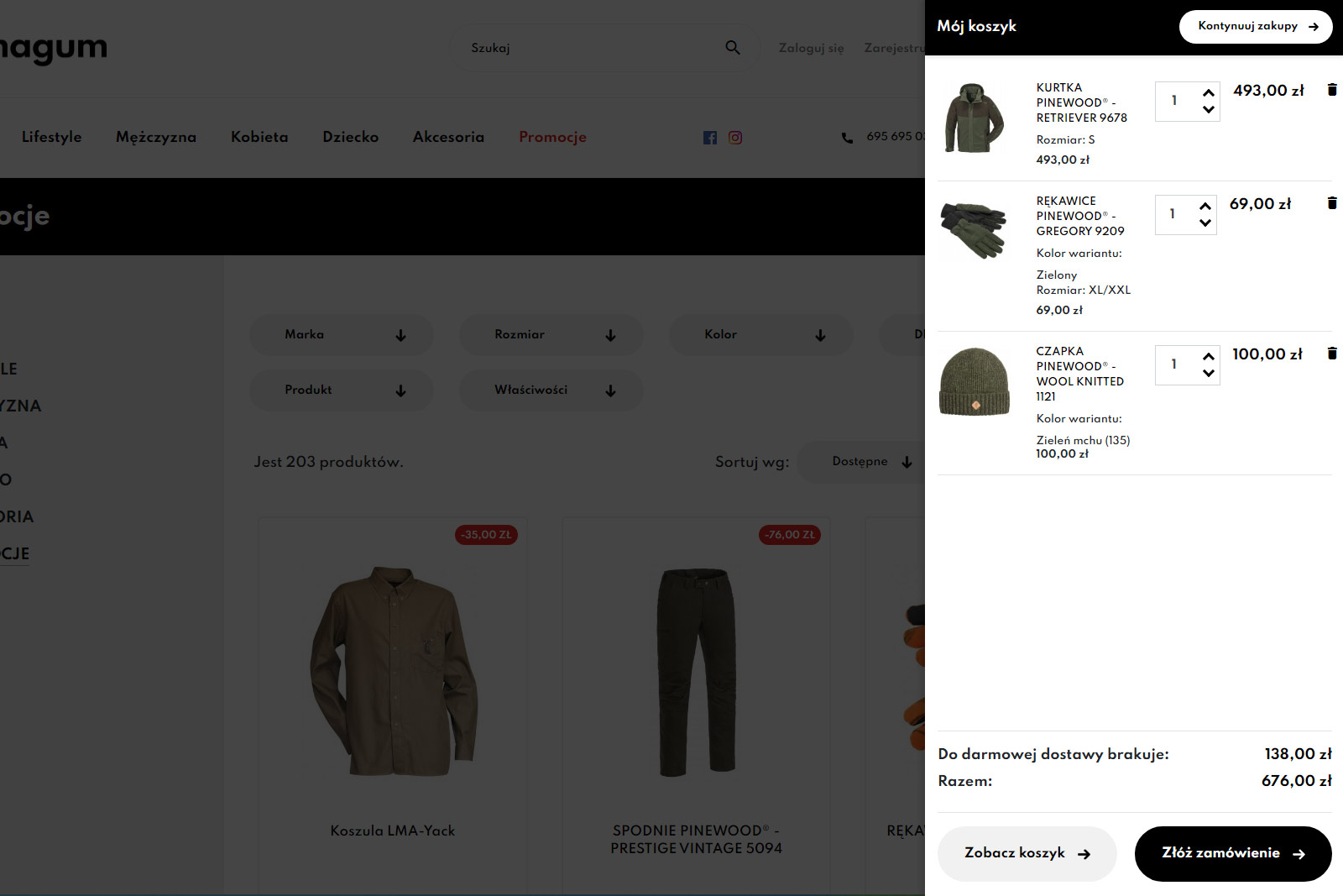 Wdrożyliśmy wysuwany boczny koszyk, który powala klientom na szybką weryfikację produktów włożonych wcześniej do koszyka. Co najważniejsze nie wymaga to przeładowania strony, więc klient nie traci czasu, a z oczu nie znika mu aktualnie oglądany produkt. Klient może również w ten sposób sprawdzić jakiej wartości zakupów brakuje mu do darmowej wysyłki.