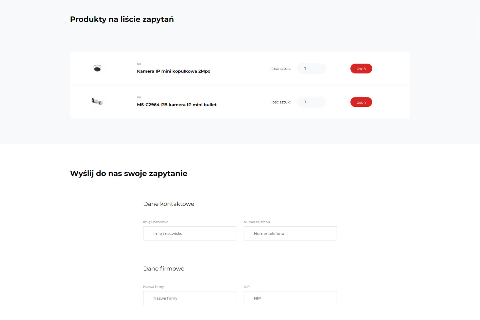 Potencjalni kontrahenci lub stali partnerzy biznesowi mogą w łatwy sposób skompletować potencjalne zamówienie i wysłać je w formie zapytania bezpośrednio do działu handlowego.