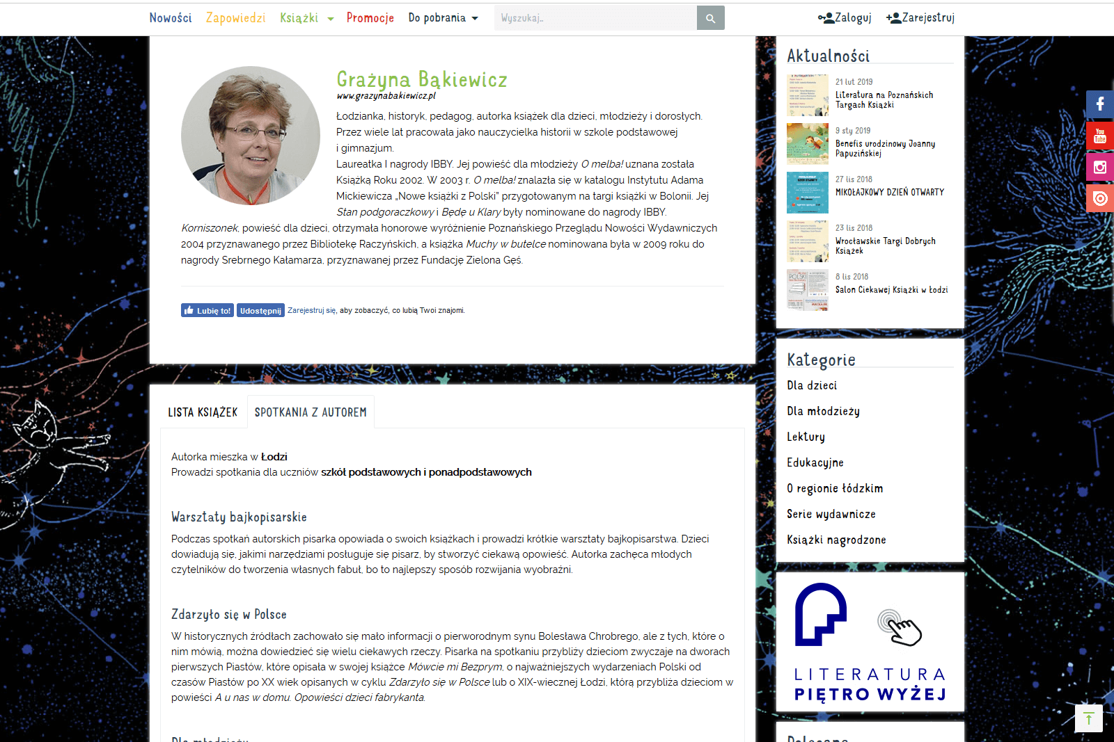 Użytkownik odwiedzający stronę nie tylko ma możliwość zapoznać się z najnowszymi pozycjami promowanymi przez Wydawnictwo, ale także z postaciami poszczególnych autorów. Poświęciliśmy ich sylwetkom odrębną sekcję, umożliwiając internautom zapoznanie się z ich biografiami.