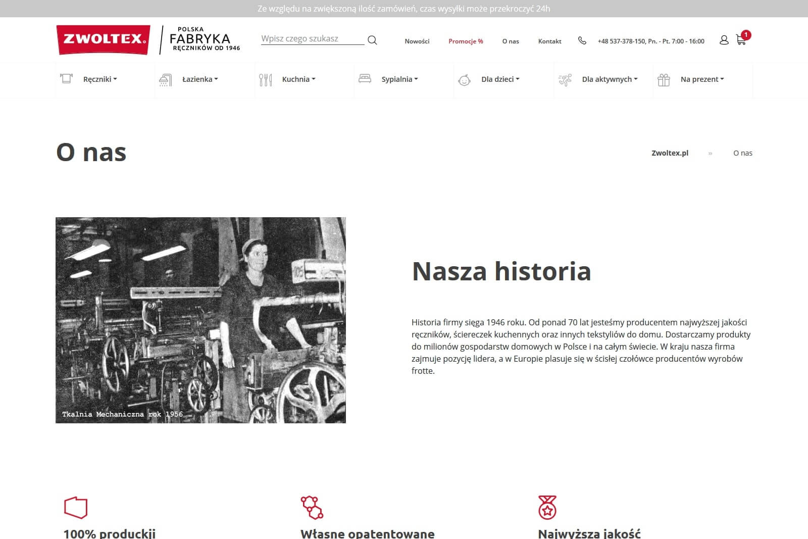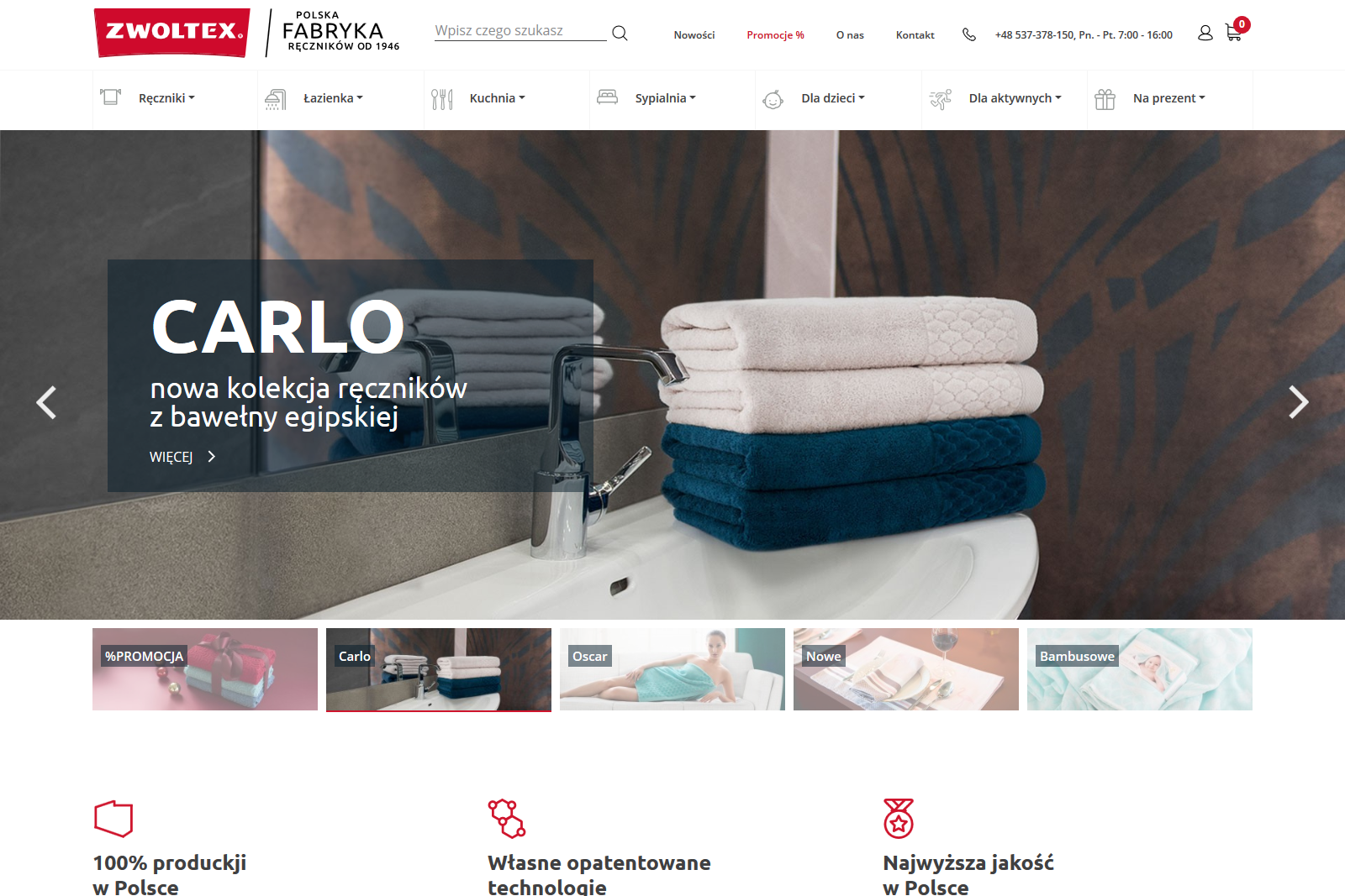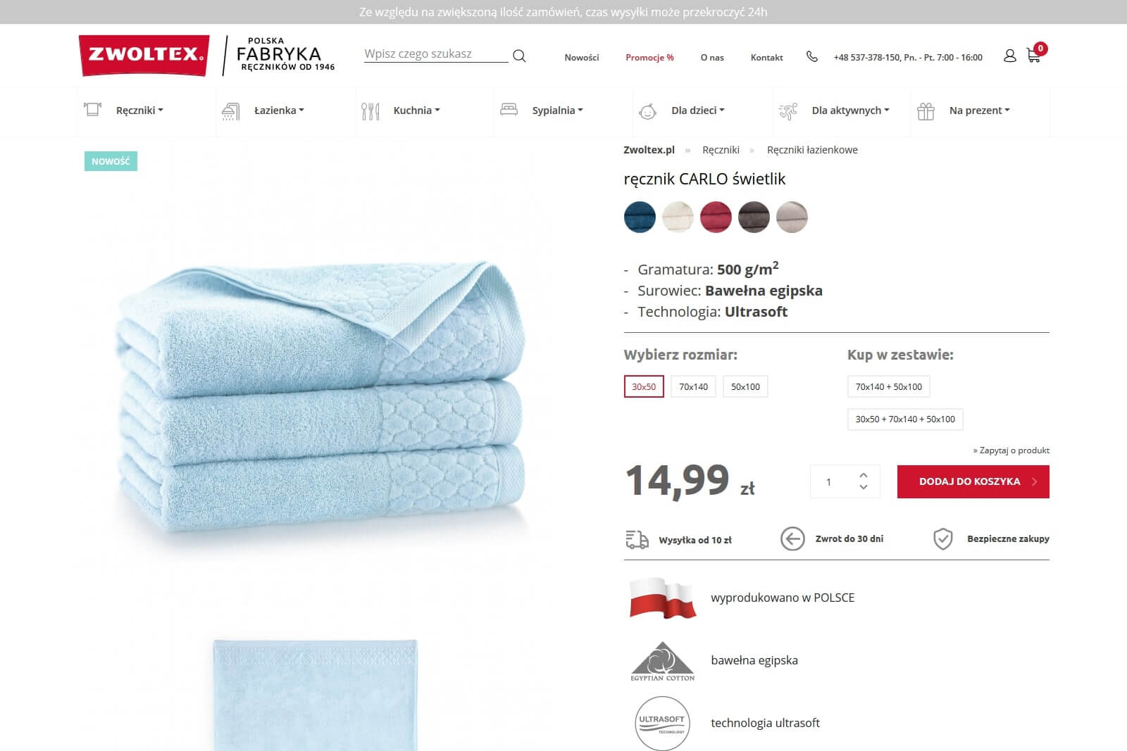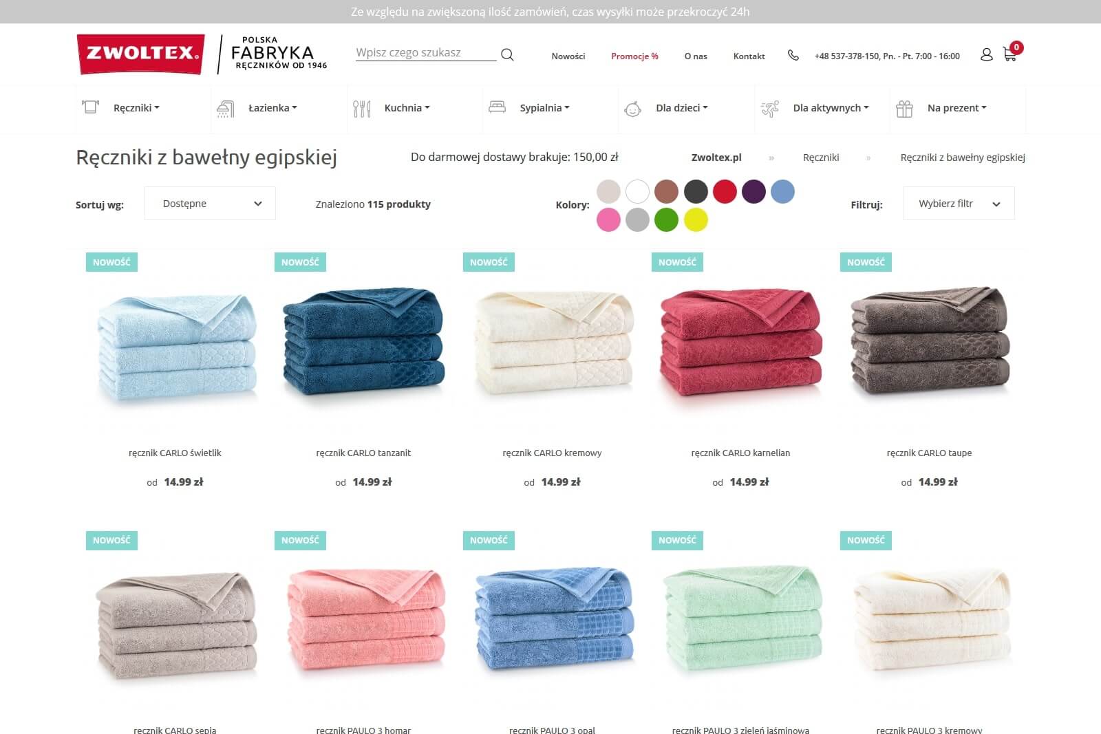 Zwoltex to polska fabryka ręczników z ponad 70-letnią tradycją oraz marka ceniona przez konsumentów już od wielu pokoleń. We współpracy z firmą działamy kompleksowo, dbając o każdy akcent obecności firmy w sieci. Jednym z naszych kluczowych zadań było stworzenie sklepu internetowego nastawionego na przejrzyste zaprezentowanie oferty oraz usprawnienie procesu zakupowego.