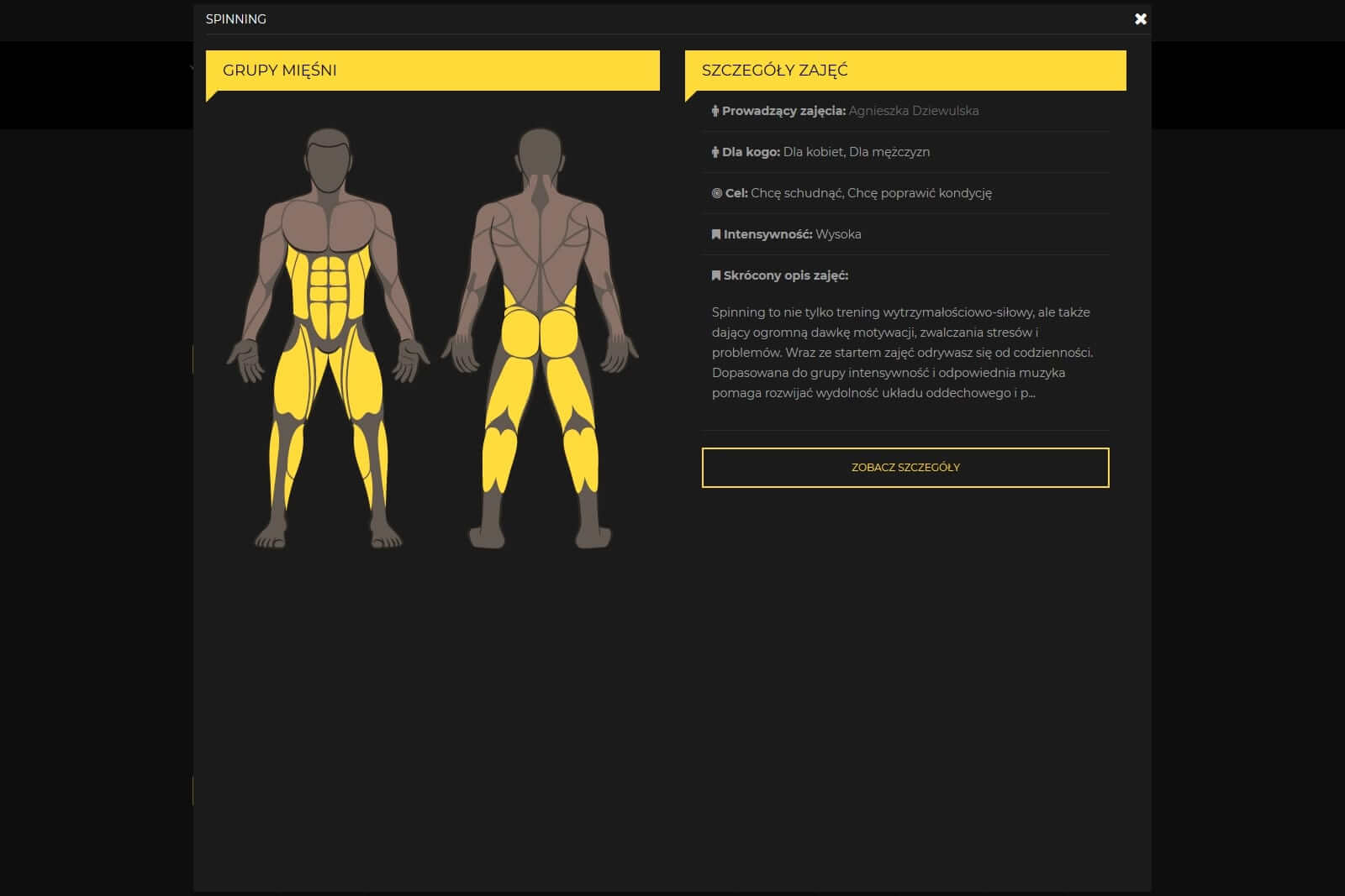 Wszystkie zajęcia na stronie mają swoje zakładki, dodatkowo z poziomu grafiku zajęć można zobaczyć szybki podgląd z najważniejszymi informacjami. Oprócz opisu opracowaliśmy zestaw atrybutów, pozwalający klientom dobrać idealne dla siebie zajęcia. Atrybuty takie jak "Dla kogo", "Intensywność" czy "Twój cel" użyliśmy jako filtry w grafiku zajęć.